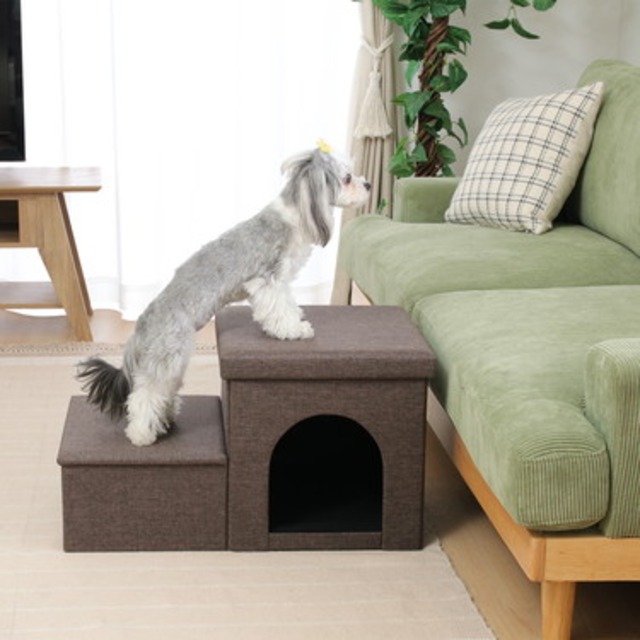 【ご注文の前には在庫確認してください。】ペットの暮らしを快適にするペットハウス付きステップ 一見ペットハウスには見えないデザインと落ち着いたカラーで自然とお部屋に馴染みます。 ソファやベッドなど自分の体格の2~3倍の高さを上り下りするペットの身体への負担を軽減するためのステップです。 広すぎない入口で中の温められた空気をキープ。ロータイプなので、負担なく出入りできます。 高さの低い箱の中にはマジックテープ付きの仕切りもついているので、ペットグッズをスッキリ収納することができます。 ハウス内のクッションには、ポリエステルボアを使用。やわらかい質感でペットが快適にくつろげます。 開いた本体に底板とクッションを入れて蓋(座面)をのせるだけ!使わない時はステップ部分もきれい折りたため、厚さ10cmまでコンパクトに! ペットとの共同生活がより快適で素敵なものになるよう、この収納付きペットステップ&ハウスをぜひお試しください。ペットとの楽しい日々がますます豊かになること間違いなしですよ。 ※商品サイズをご確認ください。ペットの安全を確保するため、定期的な点検をお願いいたします。