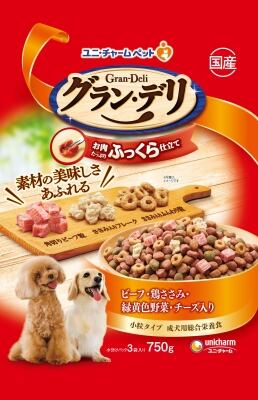 商品の特徴:メーカー:ユニ・チャームペットケア・国産のお肉たっぷり、美味しいふっくら仕立てのグルメフード・角切りビーフ粒・もちふわ粒・ささみ入り大豆フレーク入り・栄養素をバランス良く摂取できる総合栄養食・健康維持に必要なオメガ6&3脂肪酸をバランス良く調整