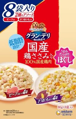 商品の特徴:メーカー:ユニ・チャームペットケア・100%国産の良質な鶏肉を調理・美味しい鶏ささみ入りレトルトパウチ・愛犬が大好きなほぐし仕立てのゼリータイプ・ビーフ入りとさつまいも入りがそれぞれ4袋ずつ入った嬉しいアソート8袋パック