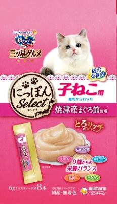 商品の特徴:メーカー:ユニ・チャームペットケア・日本各地の「お取り寄せ」素材を使用した、とろ〜りウェットタイプの上質なおやつ・幼猫用総合栄養食なので、0歳から12カ月までの猫ちゃんに適した栄養バランス設計・6gで食べきりサイズ・国産、無着色