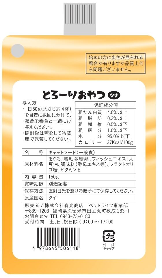 商品の特徴:メーカー:(株)森光商店原材料:まぐろ、増粘多糖類、フィッシュエキス、大豆油、調味料(酵母エキス等)、フラクトオリゴ糖、ビタミンE・とろみたっぷりのとろーりおやつです。保存に便利なスパウトパウチを使用しているので、そのまま猫ちゃんにもあげることも出来るし、キャップをしめて保存することも可能です。他にない150gの大容量ですので多頭飼いでも大丈夫!
