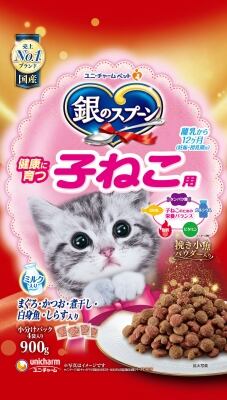 ・12ヶ月までの子ねこに適した栄養バランス設計 ・筋肉の発育を考えて高タンパク設計※ ・骨や歯の発育を考えて高カルシウム設計※ ・ビタミンEを強化した総合栄養食なので、 子ねこの健康維持により免疫力をサポートします ・ねこの下部尿路の健康維持に配慮して、 マグネシウム量を調整(含有量0.09%:標準値) ※銀のスプーン全成長段階用比
